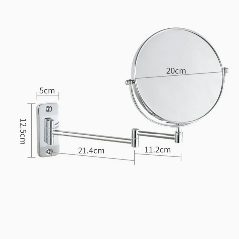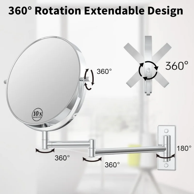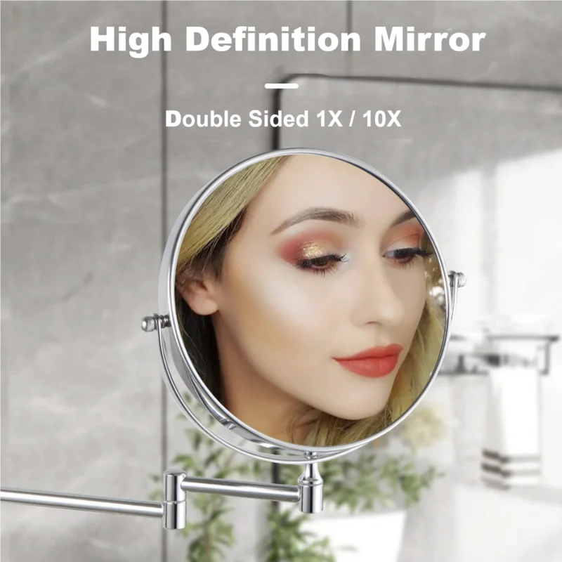 This 8-inch wall-mounted makeup mirror is perfect for precision grooming and makeup application. It features double-sided mirrors with 1X and 10X magnification for detailed viewing. The swivel design allows easy adjustment for any angle. Its extendable arm provides flexibility and saves countertop space. Ideal for shaving, applying makeup, or skincare routines. The sleek, modern design complements any bathroom décor. Durable construction ensures long-lasting use. Easy to install with secure wall mounting hardware included. Compact yet functional, it enhances daily beauty and grooming tasks. Achieve perfect results every time with this versatile bathroom mirror.