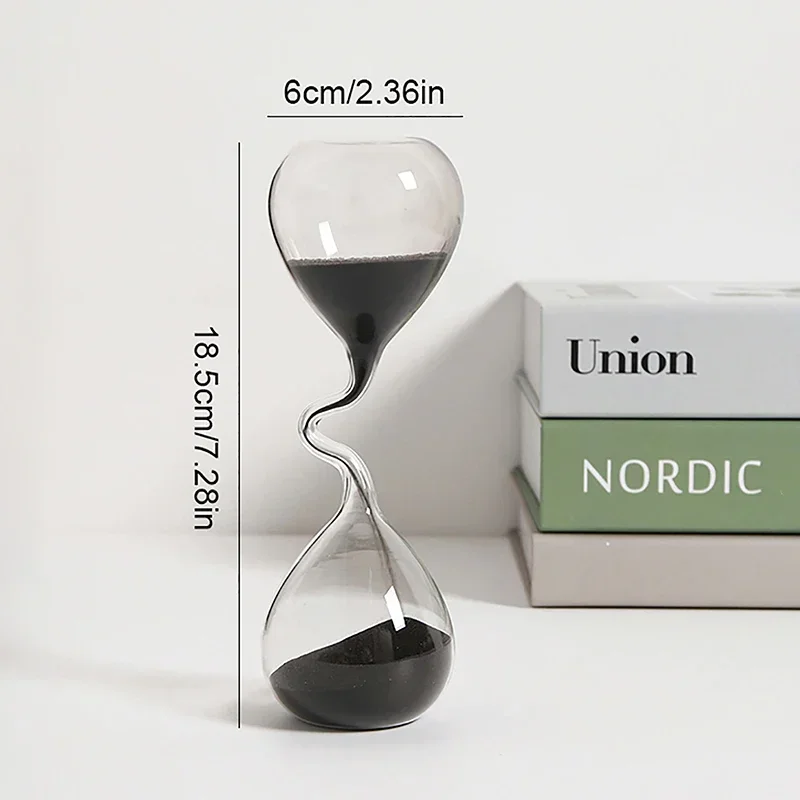 This modern black hourglass adds elegance to any indoor space. Crafted with high-quality glass, it showcases a sleek and refined design. The hourglass curve offers a visually striking aesthetic for tables or shelves. Perfect as a decorative piece for dining rooms, living rooms, or offices. Its simple, minimalist style blends seamlessly with contemporary interiors. Functional and ornamental, it measures time with flowing sand. Compact and lightweight, it is easy to place anywhere. Ideal for home decor, study tables, or gift-giving. The black finish adds sophistication and modern charm. This hourglass combines style, craftsmanship, and functionality for timeless decoration.